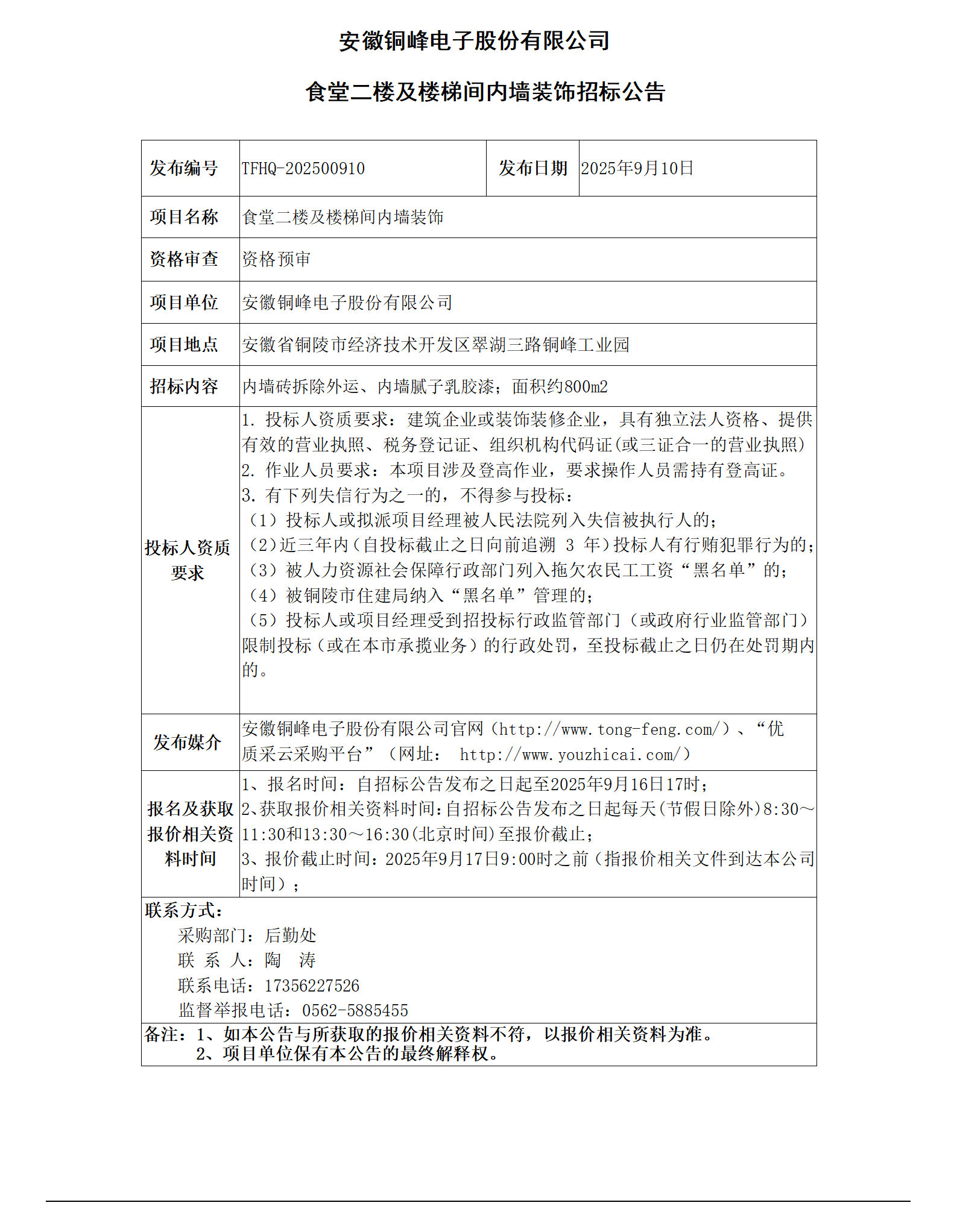 安徽銅峰電子股份有限公司 (食堂二樓內(nèi)墻及樓梯間裝飾招標(biāo)公告)_01